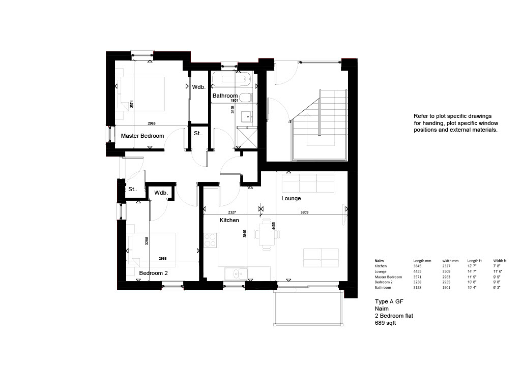 The Nairn is a two bedroom main door apartment entered at ground floor level. All accommodation is accessed from the entrance hallway, which benefits from three store cupboards.
