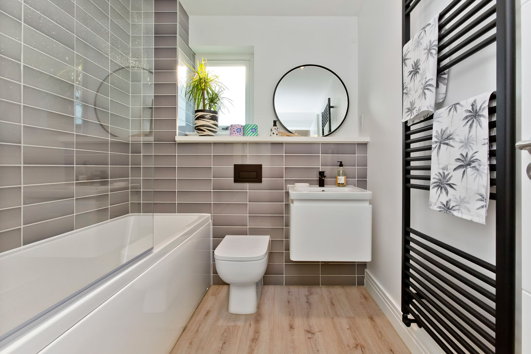 We always design our homes to be contextual to their location, consequently we felt it was appropriate to carry this into the show home. Our colour schemes, floorings and textures are all chosen to compliment the mid-century modern theme. We have selected colours from the Dulux Heritage Range to give contemporary pops of colours into rooms, together with wallpaper from UK designer Mini Moderns.